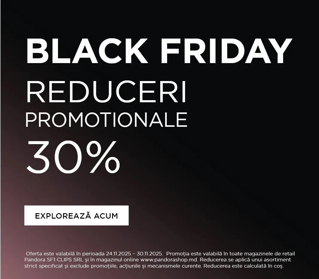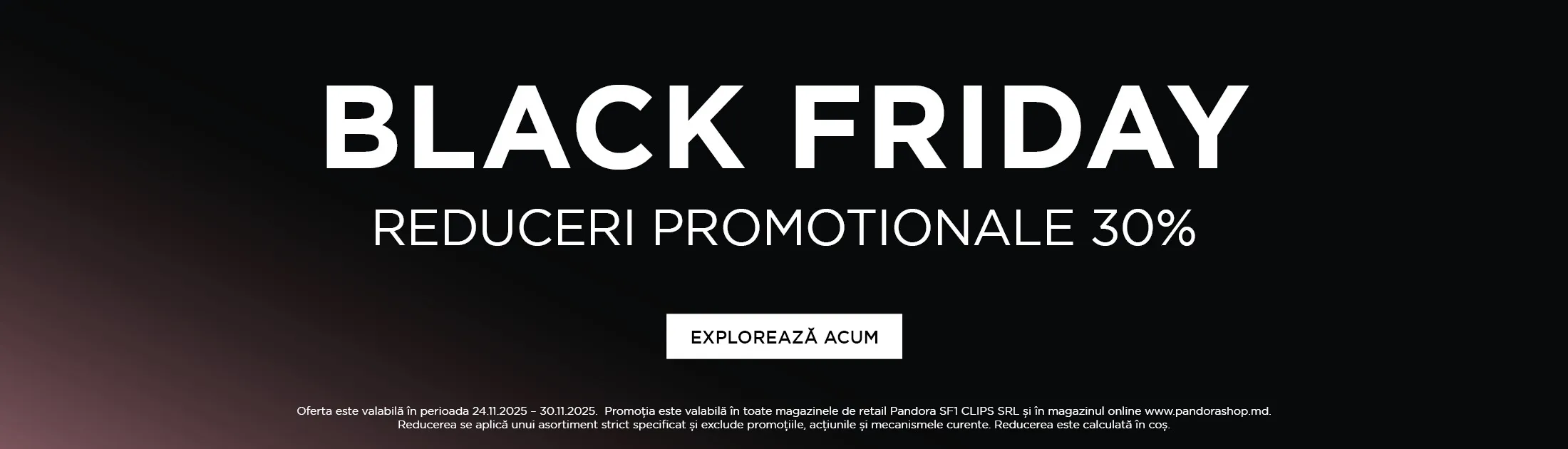 Oferta este valabilă în perioada 24.11.2025 – 30.11.2025. Promoția este valabilă în toate magazinele de retail Pandora SF1 CLIPS SRL și în magazinul online www.pandorashop.md. Reducerea se aplică unui asortiment strict specificat și exclude promoțiile, acțiunile și mecanismele curente. Fotografia are caracter informativ. Această promoție nu poate fi combinată cu alte promoții.